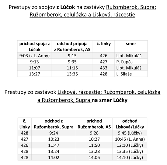 Obmedzenie sa dotkne aj autobusovej linky 424 Ružomberok – Liptovská Teplá – Lúčky, ktorá v čase uzávierky nebude obsluhovať zastávky: