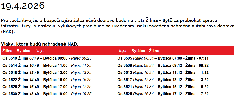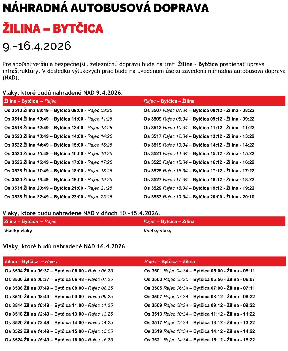 Od 9. do 16. apríla 2026 bude na trati Žilina – Bytčica platiť výluka. Počas nej zabezpečí dopravu v tomto úseku náhradná autobusová doprava (NAD). Dôvodom sú plánované práce na infraštruktúre.